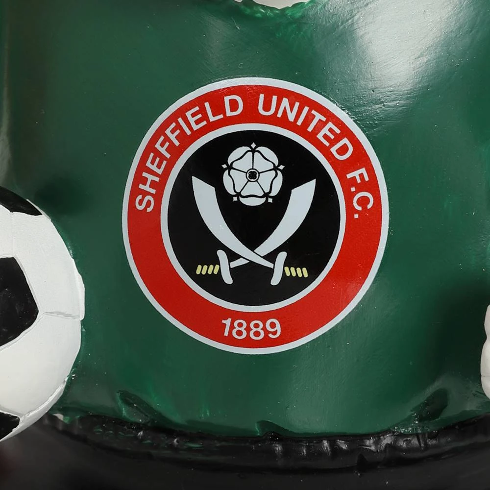 - Gnome holding football in green shirt with SUFC crest logo