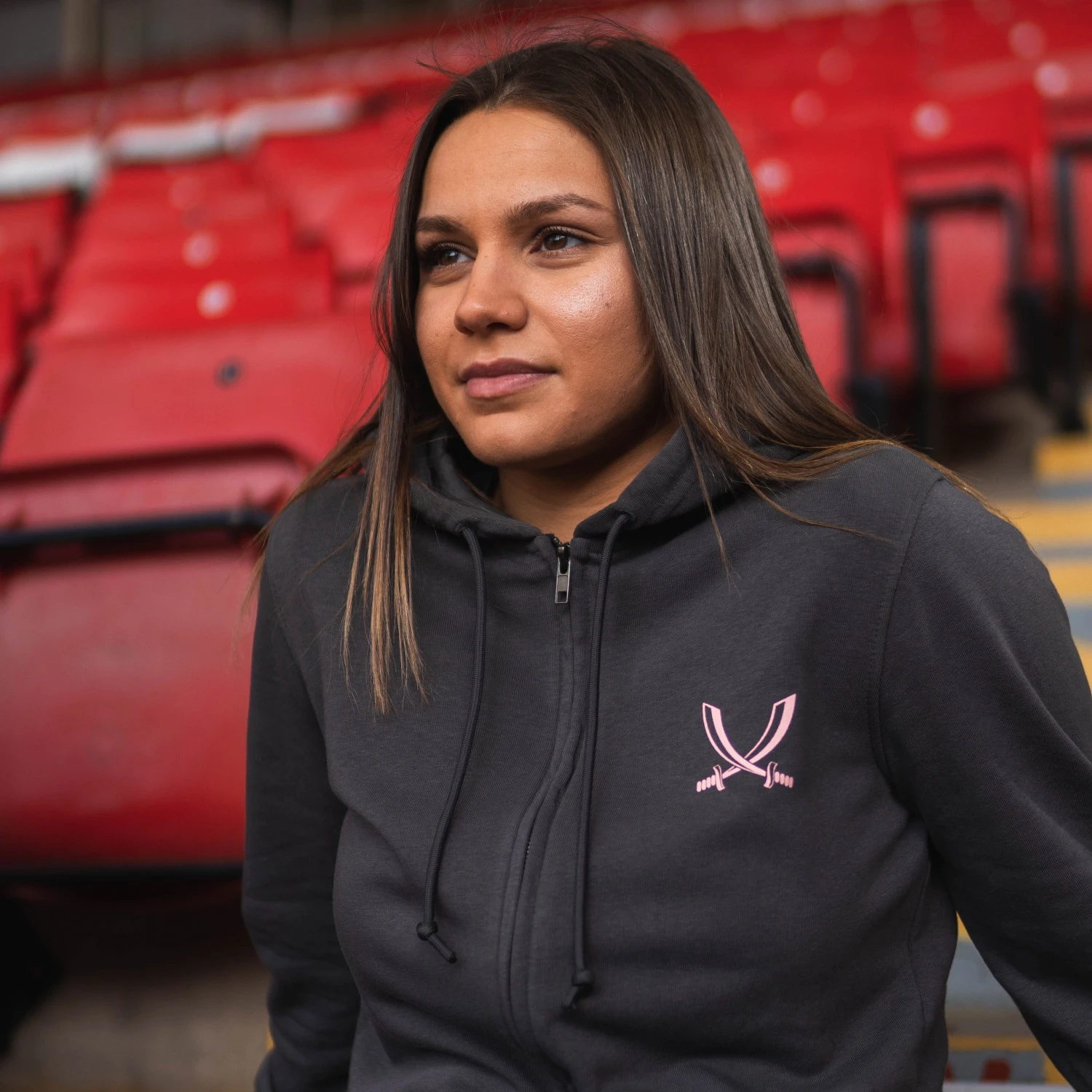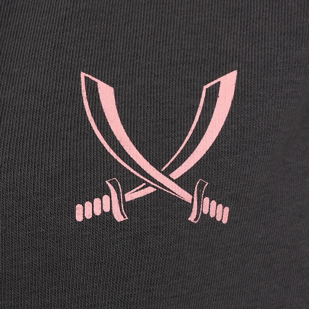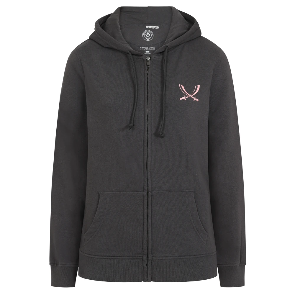 - Ladies sword jacket in grey featuring pink sword image on left hand side. Zip up jacket with hood printed on 100% organic cotton.