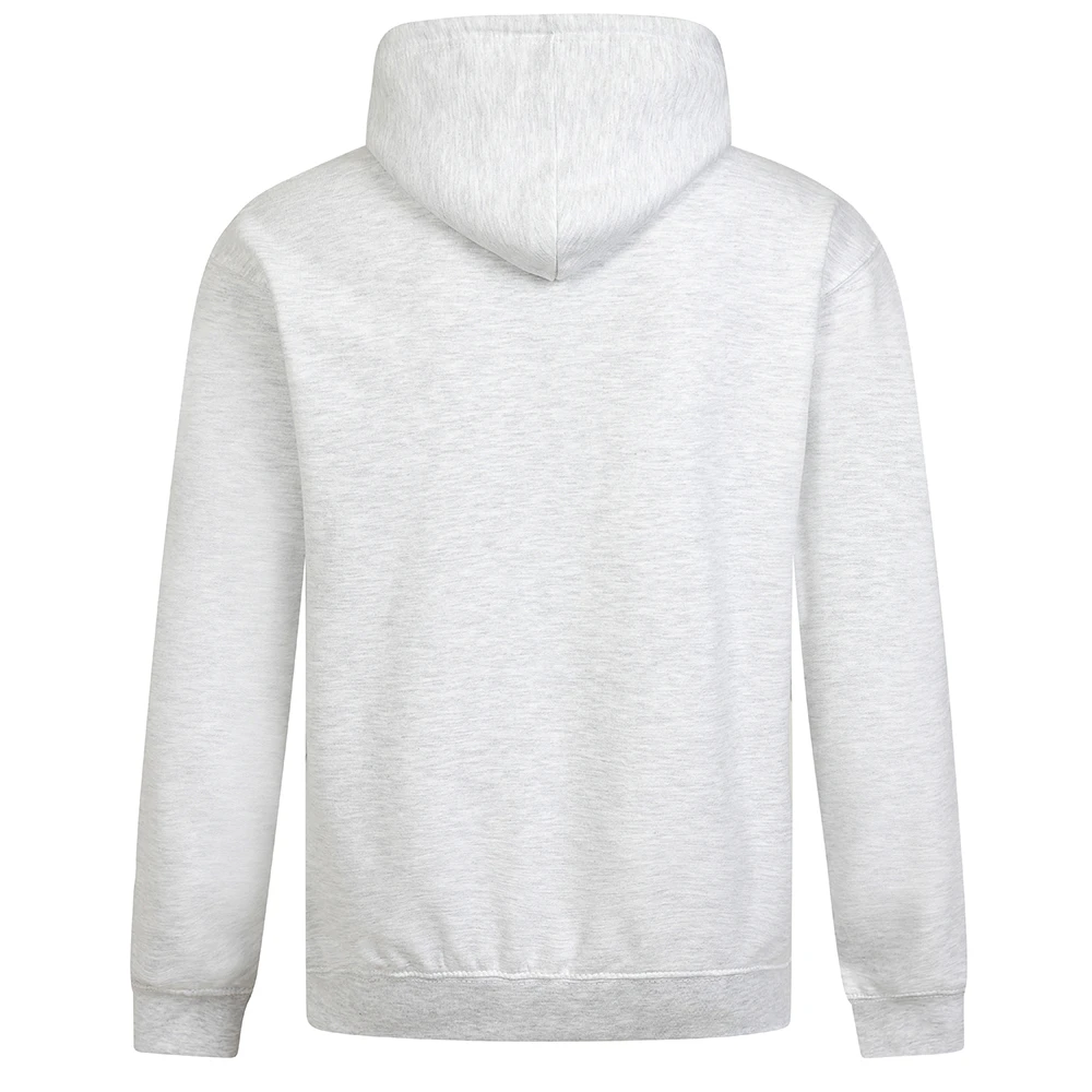 - Rainbow hoody in light grey featuring rainbow crest and progress flag hem detail.