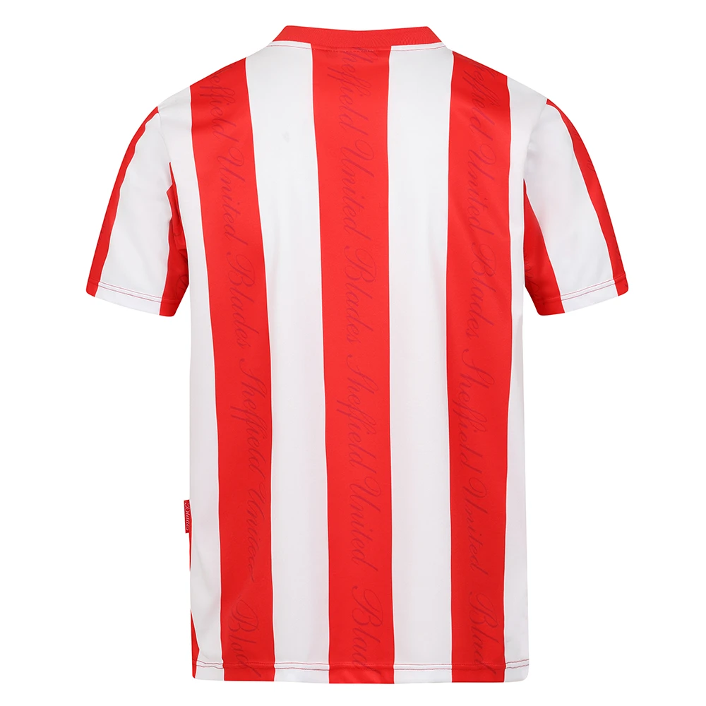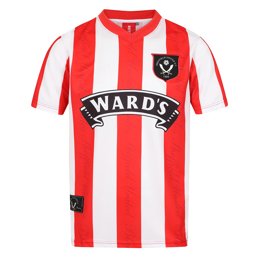 The Ward’s logo takes centre stage with the retro Sheffield United crest positioned proudly on the left-hand side. Another v-neck design shirt, with the subtle Sheffield United text running through the red stripes. Our replica has the authentic retro patch on the hem, on the right-hand side. Along with Blades tag in the left-hand side seam.